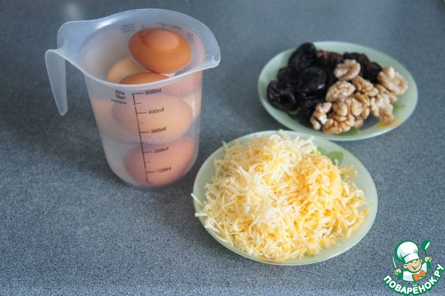 Сварила яйца. Натёрла сыр на мелкой тёрке. Чернослив замочила на несколько минут в горячей воде, орехи помыла.