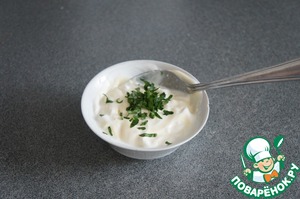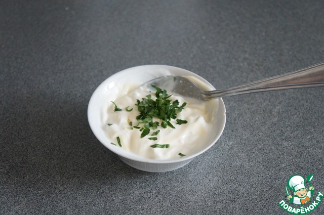 Для соуса соединила сметану, майонез, веточку петрушки мелко, выдавила чеснок через пресс.