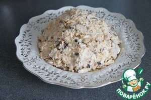 Смешала в большой миске индейку, чернослив тонкими полосками, рубленые орехи, сыр, яйца на крупной тёрке. Заправила соусом.