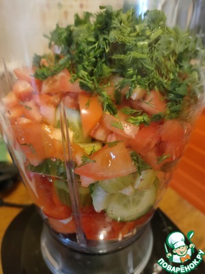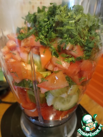 Помещаем нарезанные овощи и зелень в чашу блендера, затем обязательно наливаем томатный сок, иначе блендер не будет работать нормально!