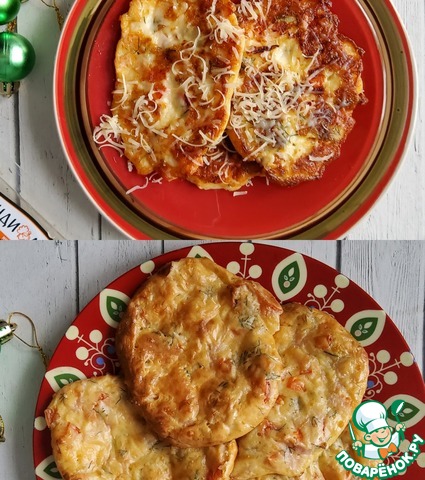 Выпеченные оладьи можно сразу подавать. Этот вариант более диетичный и немного по вкусу напоминает пиццу.