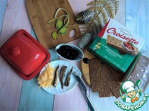 Для примера я приготовлю 3 бутерброда. Отличная закуска для крепких напитков. Готовим все продукты для бутербродов. Я буду использовать хрустящие хлебцы Круазетт с прованскими травами. Шпроты нужно промокнуть бумажным полотенцем от масла. Масло сливочное нужно вынуть из холодильника заранее, чтобы оно хорошо потом размазывалось тонким слоем по хлебцу. Сыр натру стружкой. Для праздничных бутербродов желательно взять Пармезан. Бутерброды получатся изысканными благодаря Пармезану и маслинам. Можно использовать любой качественный твёрдый сыр. Ломтик зелёной части лука порея я возьму для оформления и им можно тоже украсить бутерброд. Ломтик нарезаем тонкими кольцами.