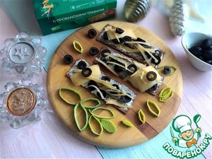 Необычный праздничный бутерброд-закуска со шпротами, маслинами и сыром на тонком слое сливочного масла. Если вы возьмёте Пармезан, то этот бутерброд будет ОЧЕНЬ праздничным.