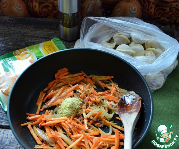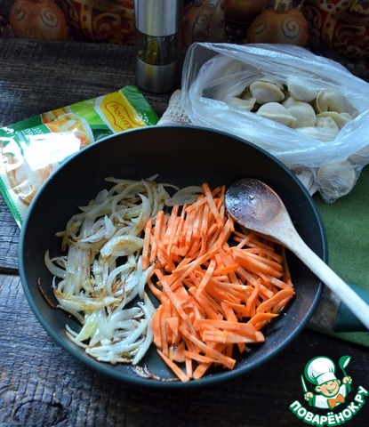 Переложить овощи в 1 л. воды, дать закипеть, добавить пельмени.
