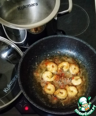Затем добавляем креветки и обжариваем их с обеих сторон. -