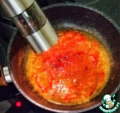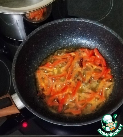Нагреваем сковороду, и в смеси 10 г сливочного и 20 г оливкового масел, слегка пассеруем острый перец.