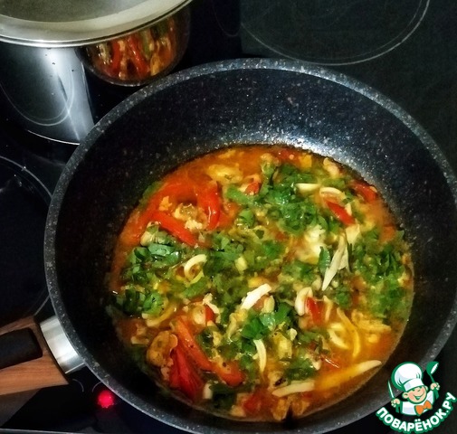 Слегка увариваем соус и выкладываем в него морской коктейль, зелень.