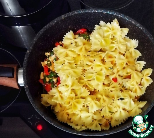 Выкладываем пасту, активно перемешиваем, чтобы она вся пропиталась соусом.