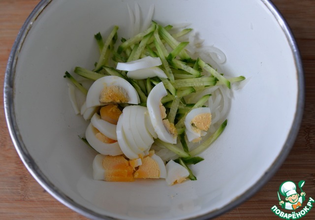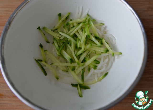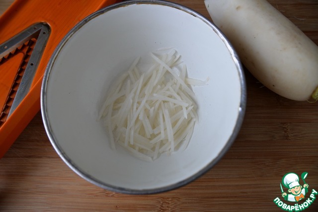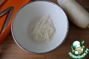 Для приготовления можно брать, как белую, так и зелёную редьку. Белая менее острая. Редьку чистим, трём или режем тонкими полосками. Слегка посыпаем солью, оставляем на 15 минут, далее отжимаем.