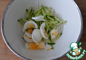 Режем пополам вдоль яйца. И далее нарезаем "полукольцами".