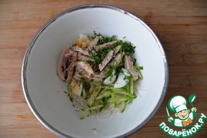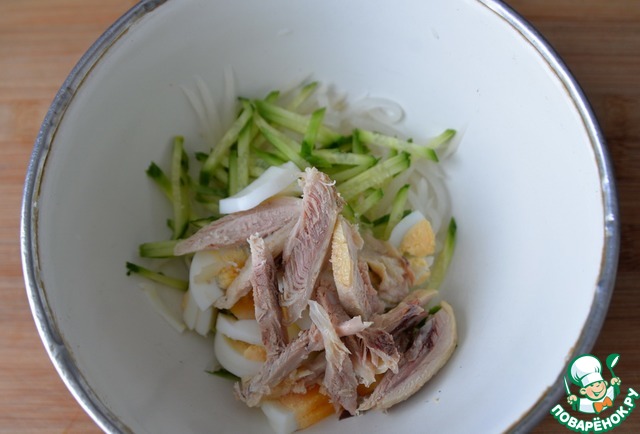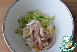 Остывшую курицу (филе) режем также полосками. Чтобы легче резать, рекомендую полностью охладить.