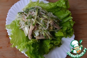 На сервировочное блюдо кладём лист салата. На него кладём салат.