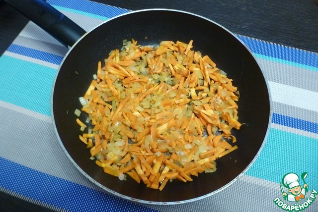Обжарить на масле лук и морковь до мягкости. Сильно не зажаривать.