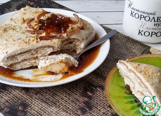 Забегая вперёд скажу, что у меня форма оказалась маловата для этого количества крема, поэтому я сделала ещё четыре пирожных. Слои укладывала как в основную форму, только хлебец делила на три части.