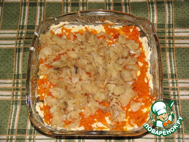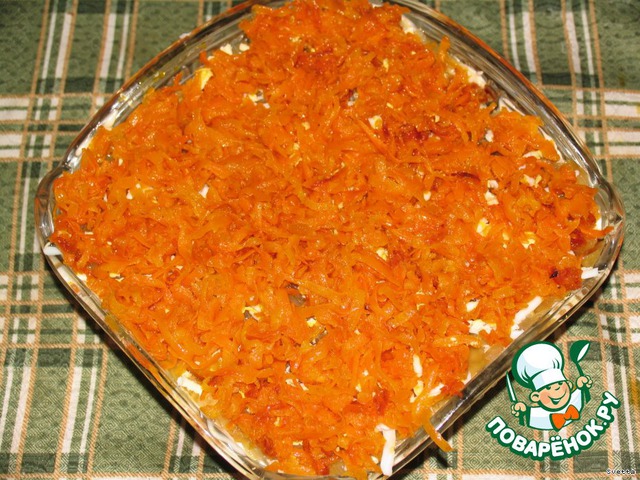 • Обжарить морковь, тертую на терке, на подсолнечном масле. Посолить, поперчить. Поделить пополам. Выложить 4-ый слой из половины. Затем сверху - оставшуюся часть рыбы- это 5-ый слой. Смазать майонезом.