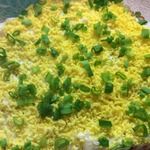 • Яйца отварить, мелко нарезать и выложить 3-ий слой, оставив один желток для украшения. Смазать майонезом.