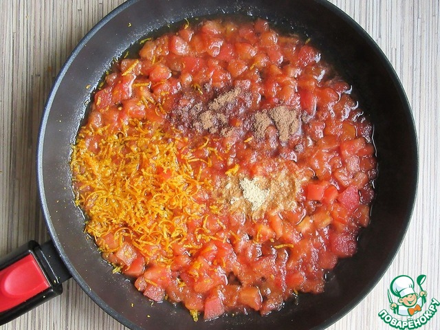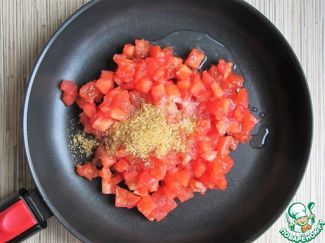 Мелко нарежьте помидоры, удаляя семена и лишнюю жидкость. Выложите в антипригарную сковороду, добавьте коричневый сахар, соль и лимонный сок.