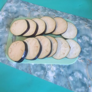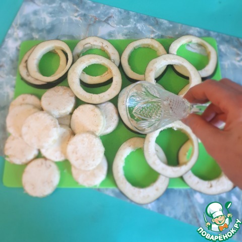 Баклажаны нарезать кольцами толщиной примерно 1 см, слишком маленькие в диаметре кольца я не использую.