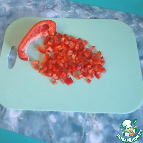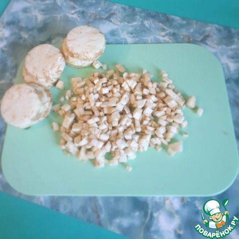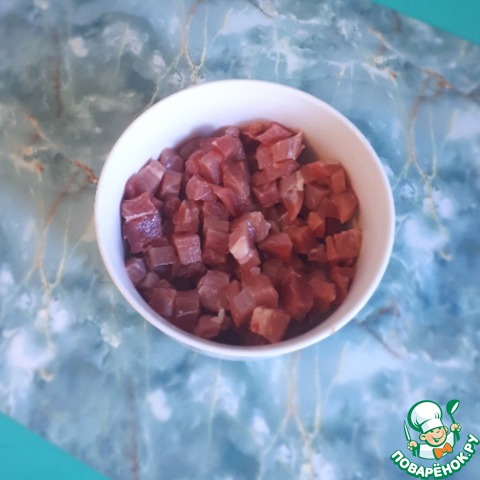 Мясо нарезать мелким кубиком, лучше резать подмороженное филе.