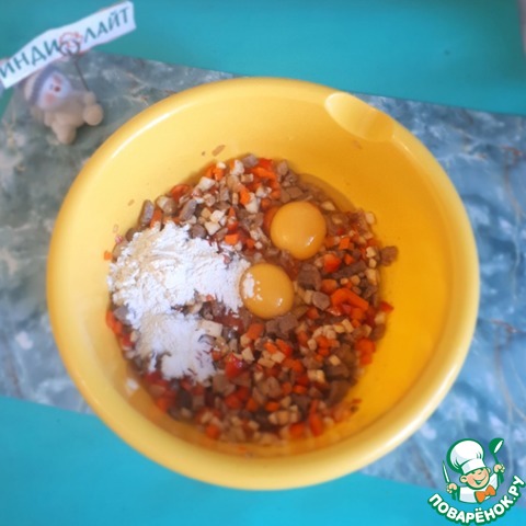 В миске смешать нарезанные морковь, перец болгарский, мякоть баклажан, жаренную индейку, добавить яйца и муку, посолить, поперчить по вкусу, все перемешать. Если любите поострее, то добавьте красный жгучий перец.