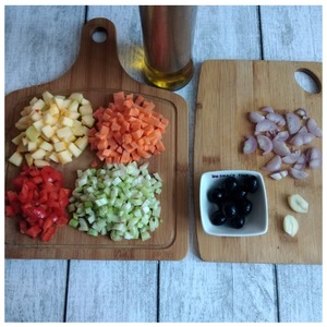 Нужно приготовить сразу все овощи. Нарезать их мелким кубиком, маслины - колечками, лук - полукольцами, как для брускетты. Чеснок разрезать пополам.