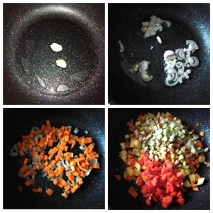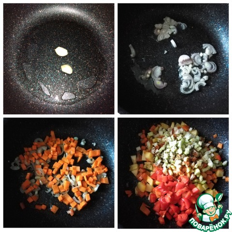 На сковороду наливаем масло и греем его. Выкладываем дольки чеснока, обжариваем их до бежевого цвета, чтобы они отдали маслу аромат и выкидываем. Далее золотим лук до мягкости. Выкладываем морковь перемешиваем, закрываем крышкой и томим на минимальном огне почти до готовности. Добавляем кабачок, через пару минут - перец и сельдерей. Высыпаем сразу все специи. Перемешиваем и готовим ещё пару минут.