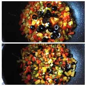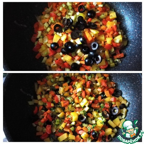 Овощи нужно сделать альденте (на зубок), чтобы они были хрустящими немного и не разваренными. Добавляем маслины колечками. Присыпаем мелко порубленной свежей петрушкой. Перемешиваем и снимаем с огня. Овощи готовы.