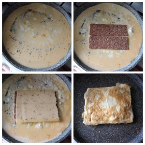 Для 2-х омлетов (на 2 порции) нам нужно разбить 2 яйца в кружку с носиком, добавить молоко, соединить. Положить немного муки и опять тщательно соединить. Солить не нужно, т к у нас в рецепте омлета будет сыр. Греем блинную сковороду, наливаем масло 0,5 ст л. Размазываем по всему диаметру сковороды. У меня сковорода D-26 см. Выливаем половину омлетной смеси, даём ей схватиться снизу, а сверху ещё пусть будет жидко, и выкладываем хлебцы два вместе (см. фото). На хлебцы выкладываем ломтики сыра. У меня были размером чуть больше и я край отломила, перегнув. Омлет схватится очень быстро. Проверьте края лопаточкой и подверните их по величине хлебцев с сыром. Лопаточкой перевернём ещё разок на обратную сторону и через 30 секунд снимем со сковороды. Тоже самое проделаем и со вторым омлетом. Омлет делается моментально. Важно все продукты сразу приготовить.