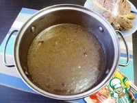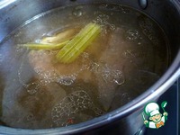 Сварить наваристый бульон из говядины. Для вкуса и аромата при варке добавить лук, морковь, сельдерей, душистый перец, чили, лавровый лист и бульон говяжий домашний ТМ Роллтон. |