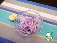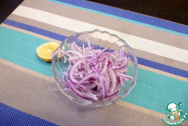Отдельно маринуется тонко нарезанный лук. Его нужно промыть водой и добавить по щепотке соль, сахар и немного сока лимона. Такой лук подаётся при подаче, он кладётся прямо в горячий суп. |