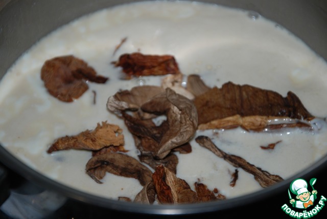 Смешайте пиво со сметаной, вскипятите, добавьте сухие грибы, сухой чеснок и посолите. Снимите с огня и оставьте под крышкой. Поджарьте репчатый лук, нарезанный полукольцами.