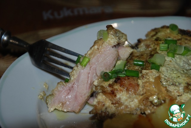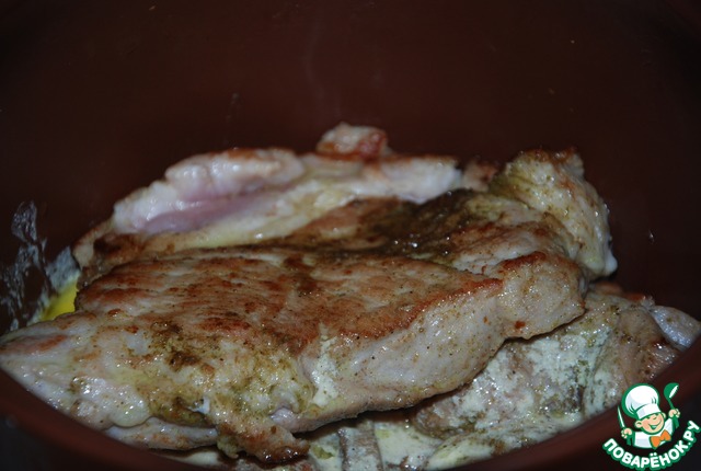 Нарезать свинину порционными кусками толщиной 1,5-2 см.