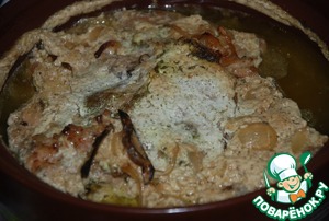 В керамическую емкость положите на дно топленое масло, слой мяса, слой жареного лука, слой заливки и так пока не закончится мясо. Закройте крышкой или фольгой и поставьте в духовку на 1,5 часа