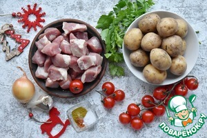Для приготовления оджахури, готовлю продукты. Мясо нарезаю достаточно крупными кусочками. Картофель использую небольшого размера целиком. Если у вас крупные клубни разрежьте пополам или четвертинки.