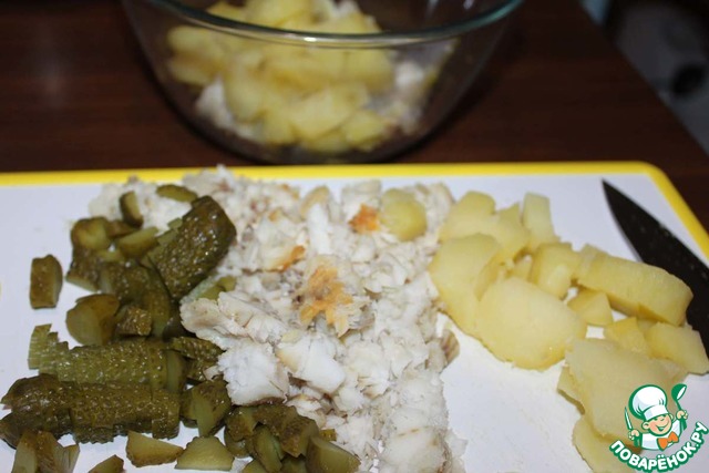 Охладив картофель под струёй холодной воды, чистим и режем его кубиками. Добавляем порезанные огурцы и рыбу.