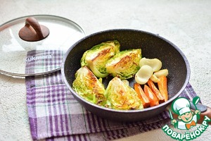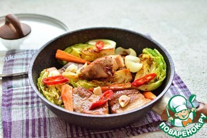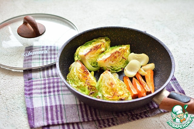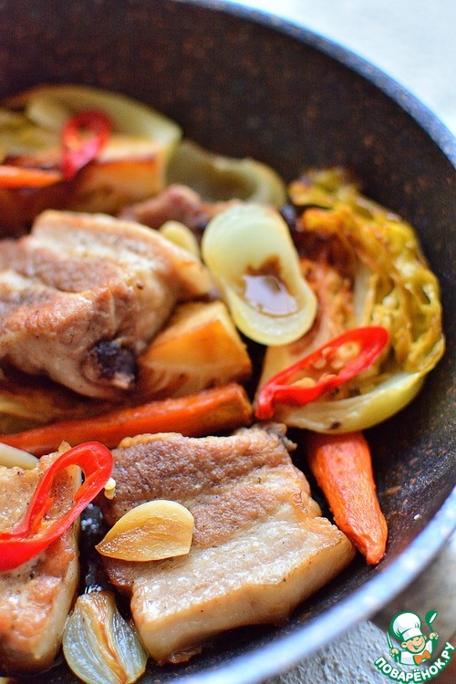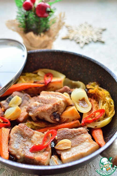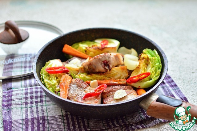 Ароматное блюдо из свинины с овощами. Обжаренная молодая капуста четвертинками получается очень ароматная и вкусная в свином соке, блюдо отлично будет смотреться в общей тарелке для гостей на праздник!