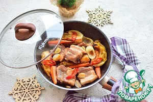 Овощи вынуть, обжарить ребра, подсолив и поперчив по вкусу.
