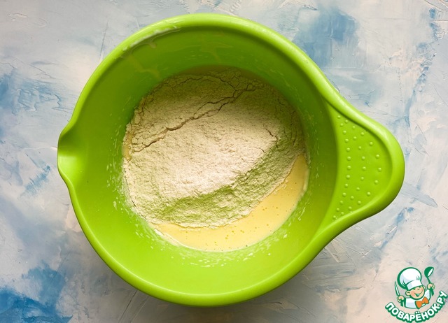 Вам необходимо просеять муку с разрыхлителем и добавить туда сахар и соль. Пару раз перемещать венчиком, но много не надо!