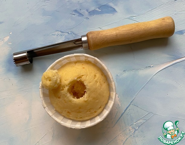 После этого, нам нужно вынуть середину из капкейков. У меня для этого есть специальное приспособление, вы можете купить его в любом кондитерском магазине. Но если нет такой возможности, то можно воспользоваться простым ножичком для вытаскивания сердцевины у яблок.