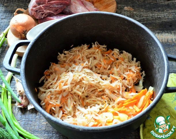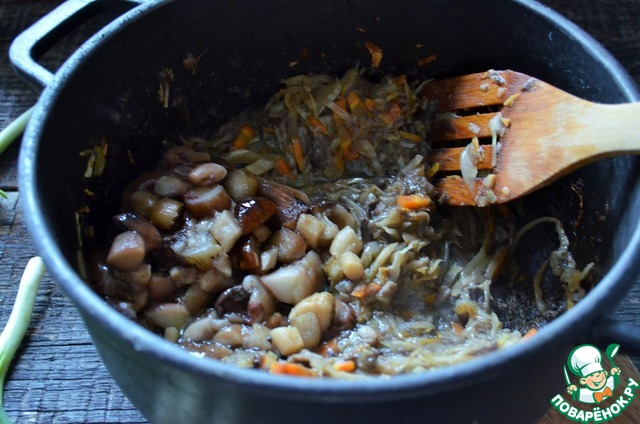 В это время обжарить на растительном масле лук, морковь, 5-7 минут огонь средний. Капусту нарезать помельче и добавить к овощам, жарить пару минут на сильном огне.