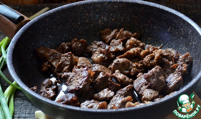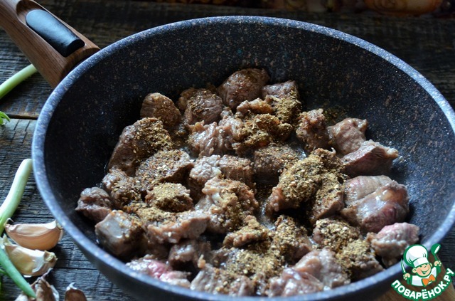 Параллельно на растительном масле обжарить кусочки говядины, добавить сухой грибной порошок, жарить на медленном огне 10 минут, помешивая.