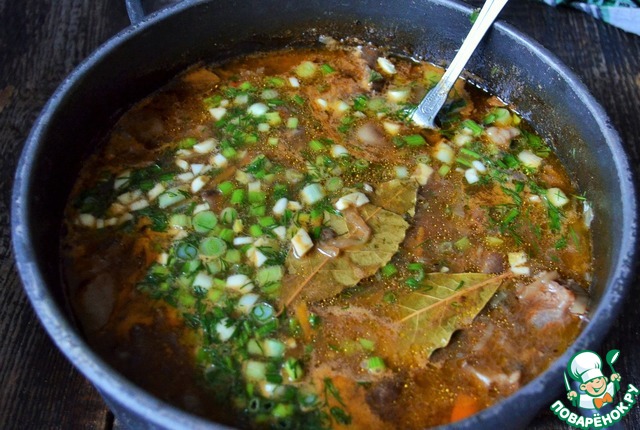 В конце заправить лавровым листом, молотым чесноком, зеленью, добавить кипяток до желаемой густоты, посолить по вкусу.