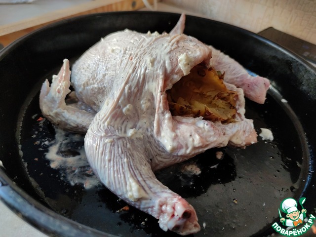 Дольку ананаса помещаем в курочку, чтобы она своими соками и ароматами пропаривала курочку изнутри.