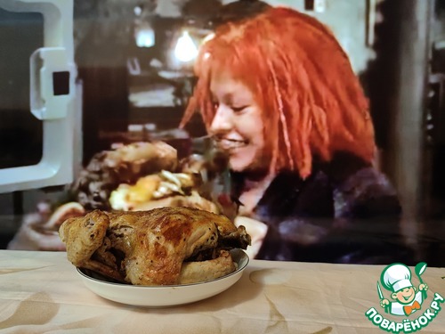 У Люка Бессона есть замечательный футуристический фильм "Пятый элемент", в котором, помимо приключений и передряг героев, показана технология будущего в приготовлении еды. Она заинтересовала бы многих хозяюшек - это дегидратированная еда. Из крошечной таблеточки, засунутой в микроволновку, получается благоухающая и шкворчащая жареная курочка! В фильме фигурируют таинственные артефакты - древние камни стихий, один из которых (камень стихии Огонь) является символом марки Гефест, а также будет нашим помощником в деле приготовления. Пятым элементом нашей курочки будет ананас, из которого мы будем использовать сок для шприцевания куриных мышц и фрагменты для ароматизации и увлажнения курочки вместо классического яблочка.