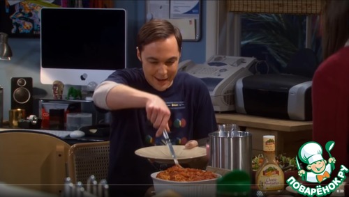 Смешиваем спагетти с соусом для подачи, для желающих добавить в соус перед смешиванием тертый сыр. Шелдон Купер сыр не любил, и в спагетти его никогда не добавлял.