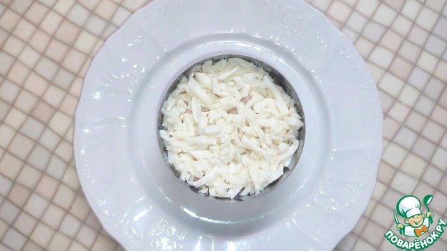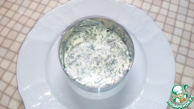 Третьим слоем натертый на крупной терке белок. Смазываем майонезом с укропом.