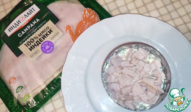 Ветчину нарезаем кубиками и выкладываем вторым слоем.