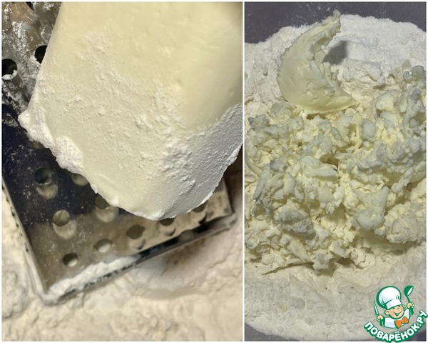 Масло коровье. Ну то, которое сейчас сливочным называют, подморозил и потёр на крупной тёрке. Будете тереть, время от времени обмакивайте масло в муку. Не так скользит в руках.