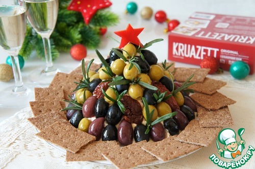 Эффектная закуска для любителей сыра. Порадуйте близких и гостей, подав такую ёлочку. Сливочный сыр с добавками, сочные оливки на хрустящих хлебцах - ну очень вкусно!
