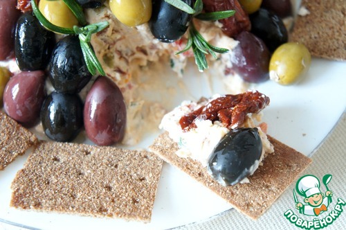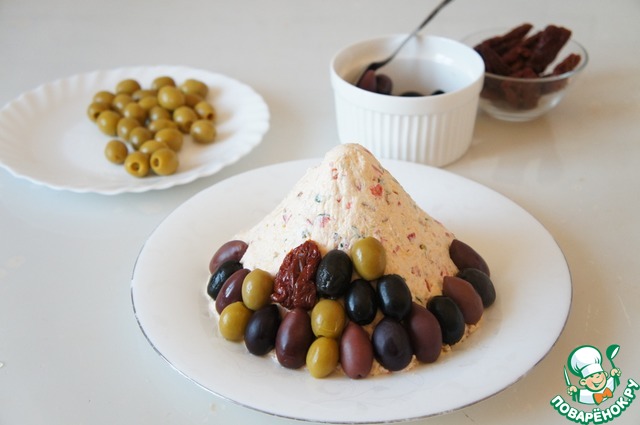 Дополните сыр вялеными томатами, оливками, перцем, корнишонами.